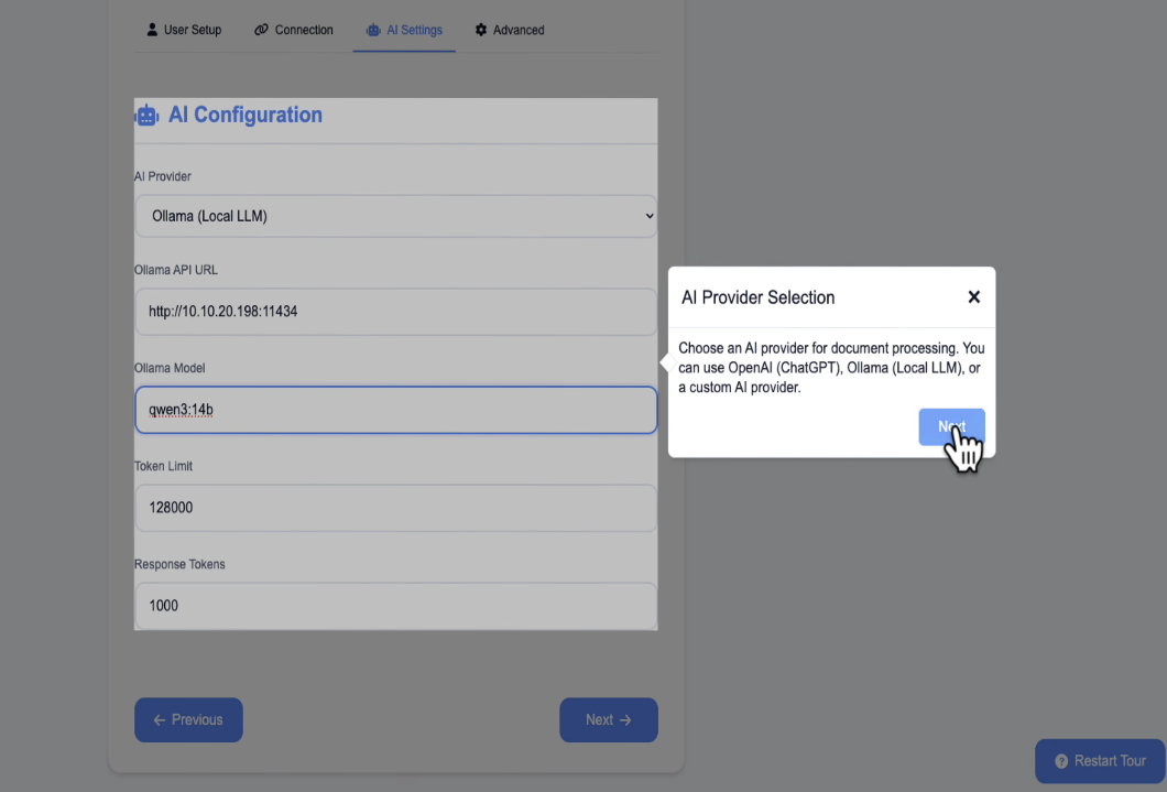 Open the Paperless AI web interface and you'll land on a setup wizard that takes you through everything.
